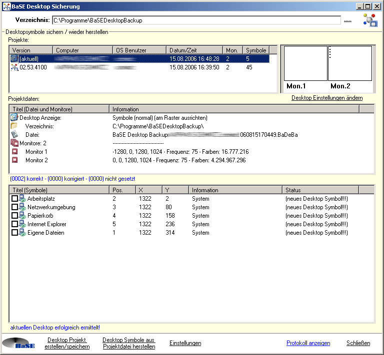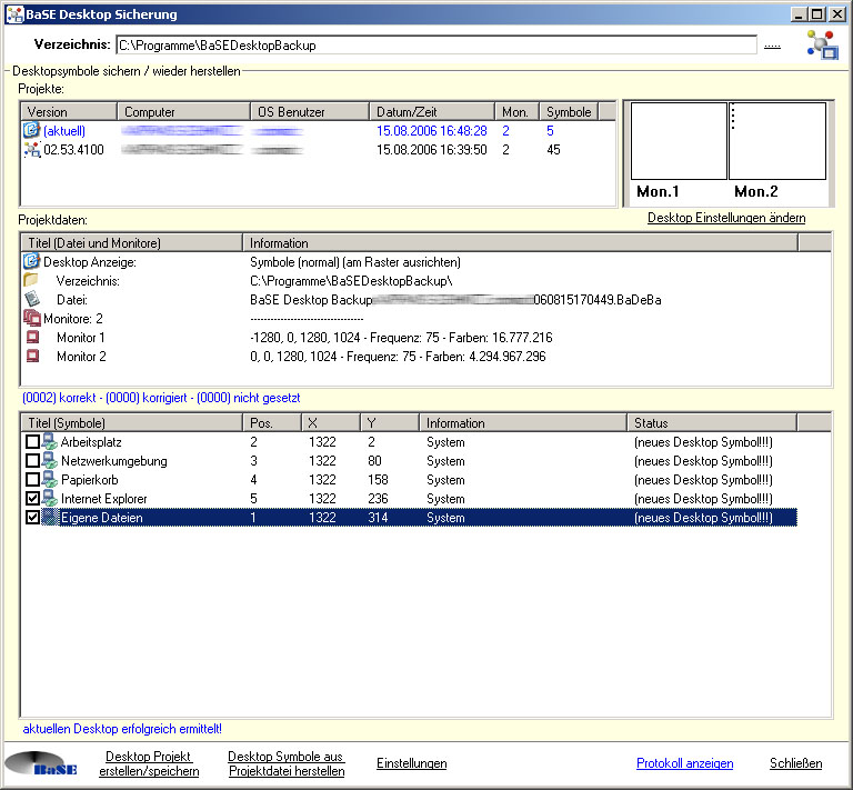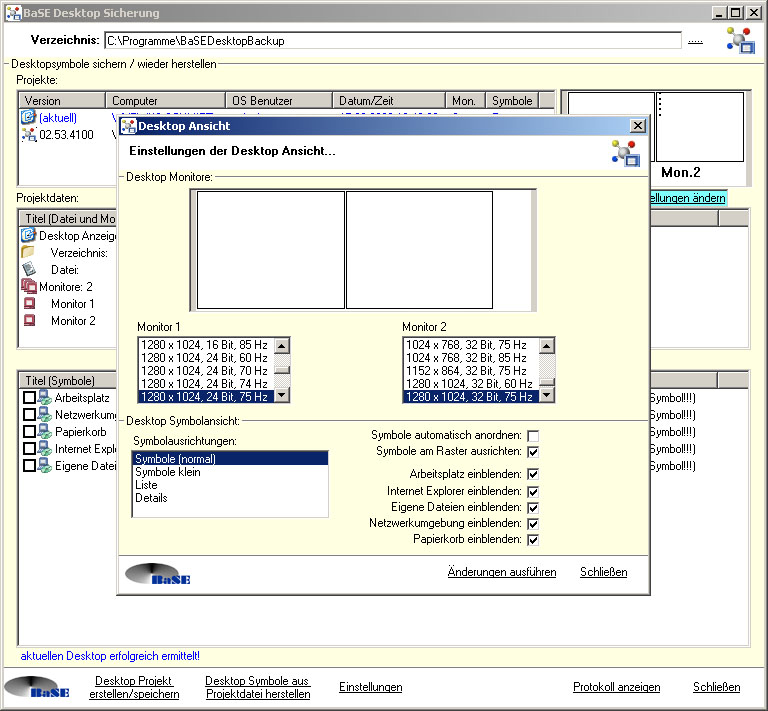 Desktop Symbole sichern, Mehrere Monitore, Wiederherstellung einzelnt / gesamt, Systemsymbole,