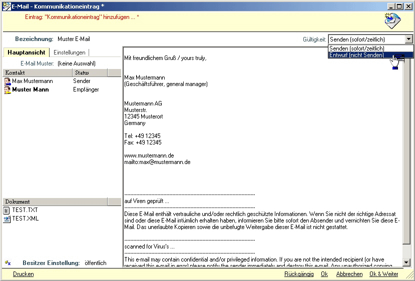 Es gibt folgende Kommunikationsarten: E-Mail, Fax, Telefon, SMS, Mobiltelefon, (interne) Nachricht, etc.